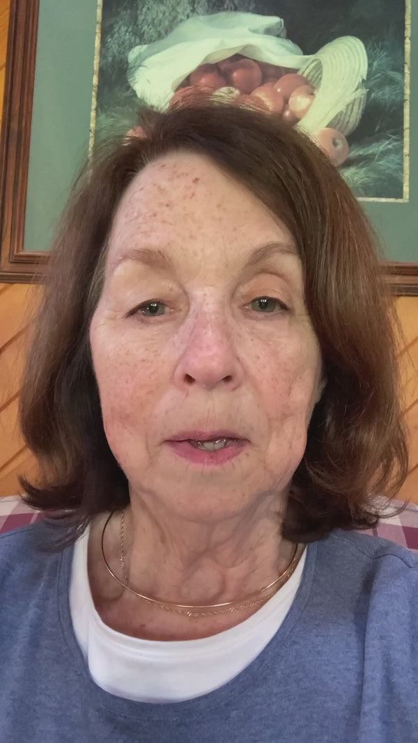 Elderly woman smiling while seated, sharing positive experience as Audien hearing aid user